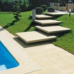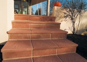 Des dalles prévues pour les terrasses (en béton, pierre naturelle ou reconstituée) peuvent recouvrir marches et contremarches. Il faudra les découper et les coller en veillant à ce que le nez de marche dépasse légèrement de la contremarche. L’assemblage doit éviter toute infiltration d’eau.