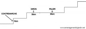 Dans les espaces verts, la hauteur courante d’une marche est de 15 cm. Le calcul donne alors : 15 cm x 2 + giron = 65 cm, d’où un giron de 35 cm.