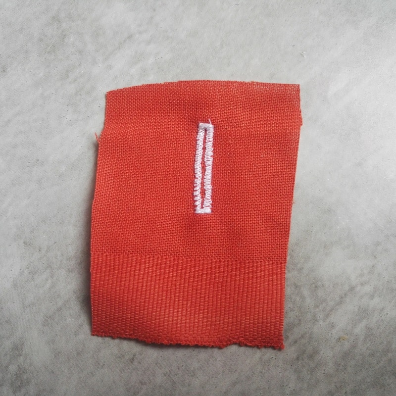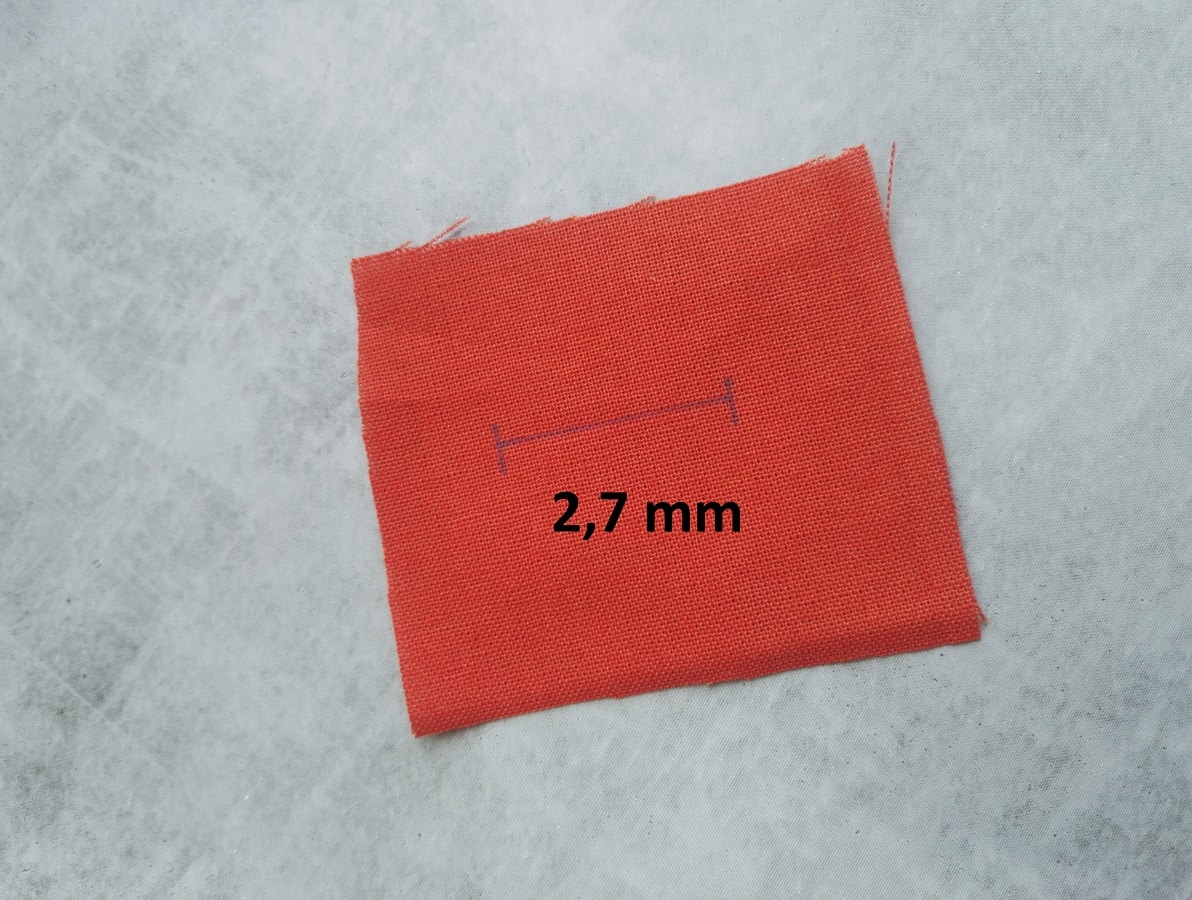 Sur ce modèle, réglez la largeur du point zigzag selon l’épaisseur souhaitée : plus le chiffre grimpe, plus la boutonnière gagne en relief. L’écart entre les points peut aussi s’ajuster pour rendre le zigzag plus ou moins serré. Un aperçu : sur la photo, droite réglée sur ‘3′, gauche sur ‘5′ ; le rendu change notablement. Personnellement, un réglage à 4 offre un résultat équilibré. Pour la longueur du point, descendez à 0,5 pour un zigzag bien dense.