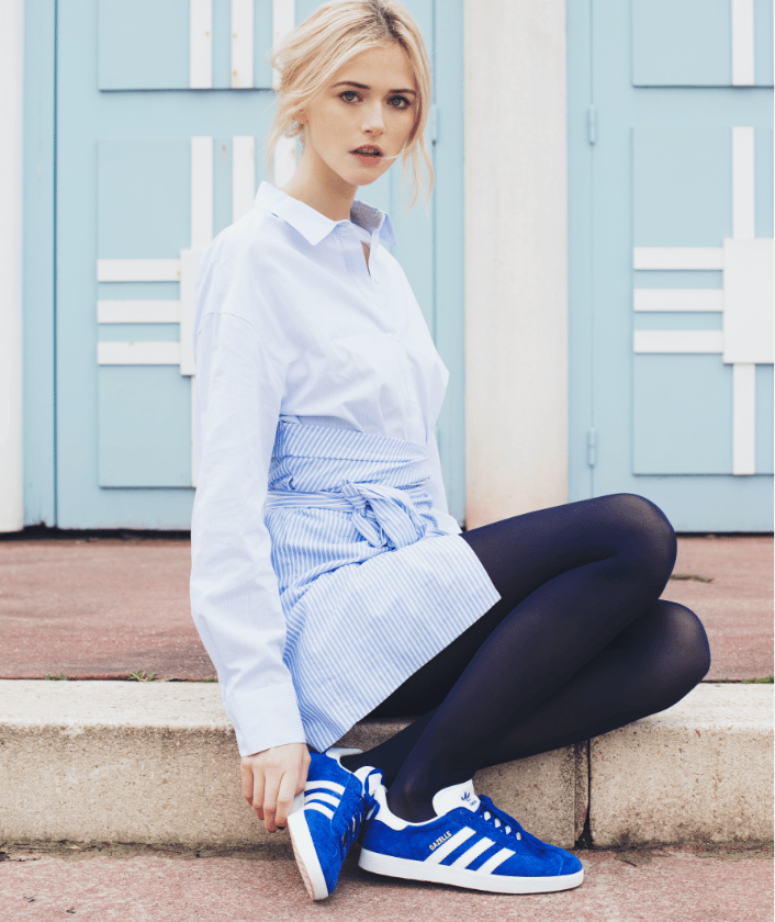 Côté chaussures, tout est permis : bottes, bottines, derbies, baskets, ballerines… Le plus simple reste d’assortir collants et chaussures pour allonger la jambe et garder une certaine harmonie. Mais rien n’interdit de jouer sur les contrastes : des chaussures ouvertes, à brides ou à talons mettront en valeur la couleur du collant, tout en permettant de porter vos sandales fétiches même en hiver.
